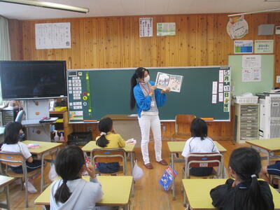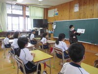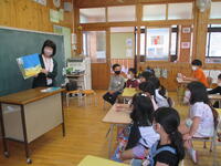 1年生では、「どろんばあ」という絵本を読み聞かせしていただきました。「どろんばあ」「ひとつ ひとつめこぞうさん」など、「どろんばあ」のかけ声とともに、お化けたちが次々と現れます。お化けは怖いというイメージがありますが、絵本の中のお化けはどれもかわいらしく、子どもたちも笑顔で聞いていました。