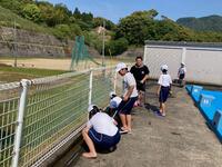 16日(火)には、中学部の生徒がプールの中を清掃しました。昨年度プールの改修工事が行われたので、プールの床や壁は、きれいな水色で塗られています。中学部の生徒は、その床や壁をスポンジで丁寧に磨き上げました。