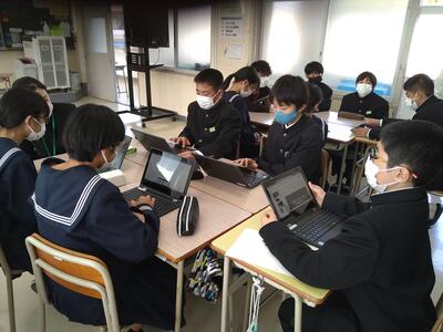 11月29日(水)、社会福祉協議会東郷支所の方々3名をお招きして7年生の総合的な学習の時間が行われました。7年生の総合的な学習では、日向市東郷地域振興計画の東郷地域の持続可能性を高める7つの方針をもとに、3つのグループにわかれて福祉の視点からそれぞれのグループで東郷町を考える学習を進めてきました。
