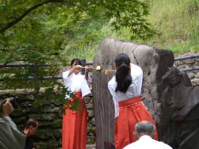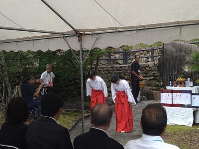 第1部の歌碑祭では、牧水先生の歌の朗詠が行われました。その語、参列した方々一人一人から、献酒が行われました。東郷学園9年生の2名の生徒が、巫女の姿で献酒の補助として参加しました。