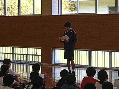 それぞれの部活動キャプテンから、大会に向けた熱い決意表明が述べられ、児童生徒の皆さんから大きな拍手をもらいました。