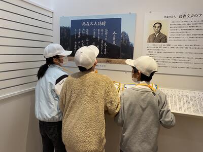 若山牧水記念文学館には、高森文夫先生に関する展示もありました。6年生は、先日の高森文夫詩碑祭に参加しており、「高森文夫先生についても調べよう」という意見が子どもから出されました。そこで、東郷公民館にある高森文夫先生の展示物や詩碑についても今後調べていく予定です。