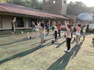 行縢の朝は早いです。6時に起床、身支度を済ませ、6時45分から3階テラスで朝のつどいです。昨日は静かに過ごすことができた5・6年生。館内の方に迷惑をかけることなく、しっかりと寝ていたようです。また、時間を守って行動できたところからも、やる気を感じます。