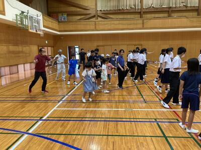 夏祭りに向けて、昼休みの時間に盆踊りの練習をしました。この踊りは、山陰百姓一揆で犠牲にとなった御先祖を偲ぶ踊りです。踊りを通して、この史実を私たちの誇りとし、先祖に感謝する気持ちを育んでもらおうと考えています。今回の練習には、4名の地区の方に来てもらい、足の動かし方を中心に教えてもらいました。小学部の児童も中学部の生徒もたくさん参加し、地区の方も喜んでいました。
