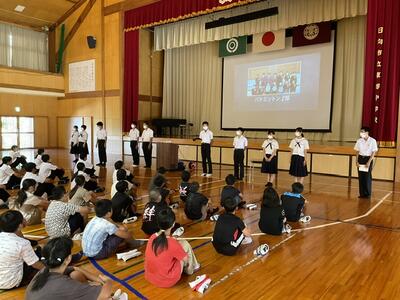 5~9年で構成される後期ブロックの1回目の内容は、日向・東臼杵地区総合体育大会の結果報告でした。テニス部・バトミントン部・野球部の9年生がそれぞれの大会結果を報告しました。締めくくりとして、「スポーツは、自分の力を伸ばしますし、お互いの絆を深めることにもつながります。ぜひ部活動に挑戦してください。」と5・6年生に呼びかけていました。