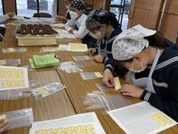 「薬草のまちづくり」に取り組んでいた東郷まちづくり協議会は、「カモミールを東郷の特産品にしたい。」という思いがありました。そのことを意見交換会で話すと、9年生から「カモミール入りのパウンドケーキを作って販売まで東郷学園の生徒で行ってはどうか。」という意見が出されました。その意見を実現しようと話合いを繰り返した結果、おからを使ったカモミール入りのドーナツを製作することになりました。製作したドーナツを道の駅とうごうで販売したところ、令和3年度も令和4年度もすぐに完売しました。
