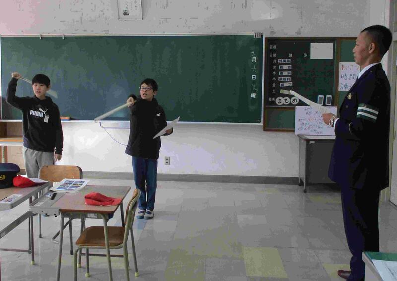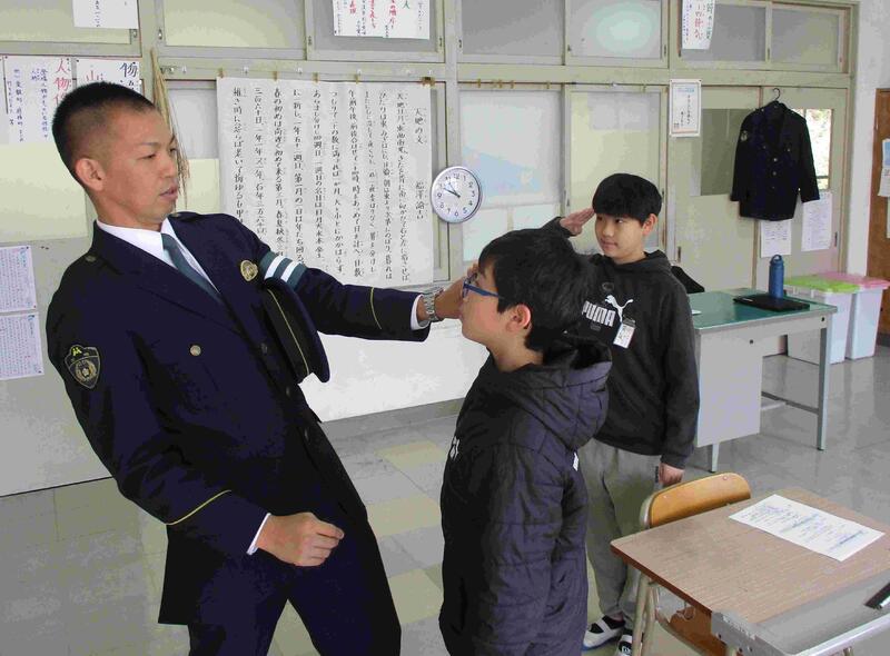 突然のお知らせですが、来年1月7日に日向警察署で行われる「110番の日」のイベントに、本校の6年生2人が1日署長として参加することになりました。2人で警察の方々に号令をかけたり、警察車両の出発を見守ったりと大役をまかされました。写真は、一昨日行ったイベントに向けた練習や制服採寸の様子です。この日は、その他にも日向警察署のお計らいにより様々な体験をさせていただくことになっています。1月7日を楽しみに待ちたいと思います。