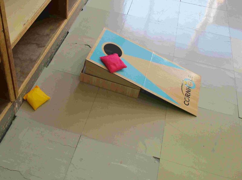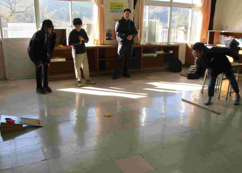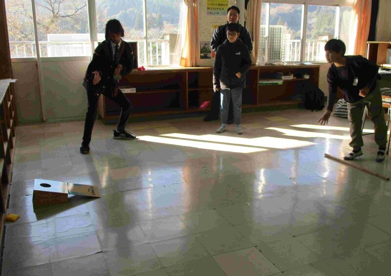 今日の2時間目の外国語活動を見に行くと、ALTと一緒に質問ゲームをしていました。これは、ALTからの英語による質問に対してちゃんと英語で答えることができると、的になる箱目めがけて軽く重みのある袋を投げることができます。その箱に袋がのったり、箱の丸い穴に入ったりすると得点になるというゲームです。(少しカーリングに似ています。)