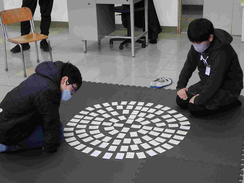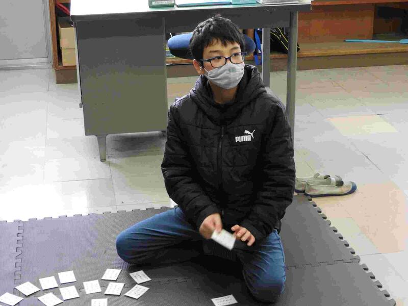 今日の1時間目は2学期校内牧水かるた大会でした。今回は一対一で札を取り合うタイプの大会で、最後まで手に汗握るとても白熱した戦いとなりました。結果は2人とも30枚ずつ取り合うという劇的な引き分けでした。2人ともよく頑張りました!