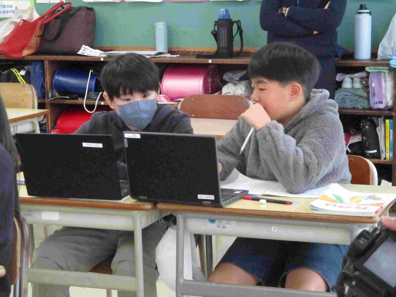 今日の2時間目の国語は「おすすめパンフレットを作ろう」という学習で、タブレットで調べながら必要な情報を使ってパンフレットにまとめる学習をしていました。