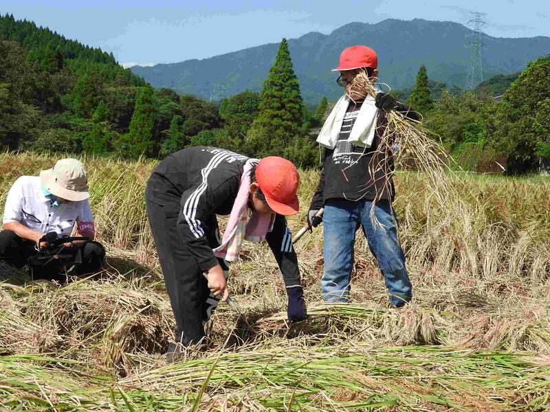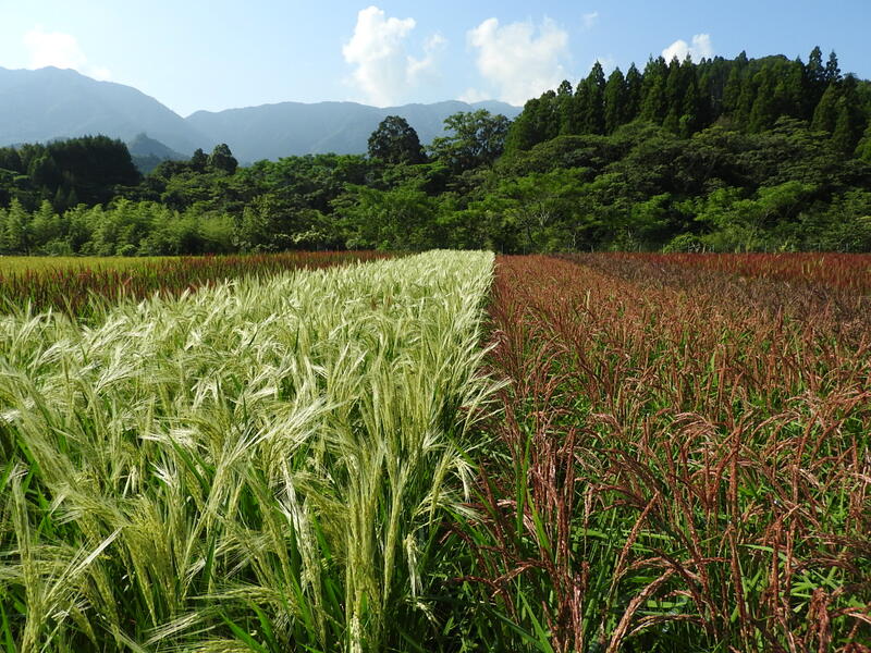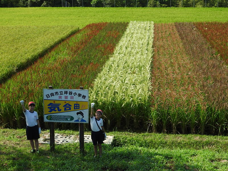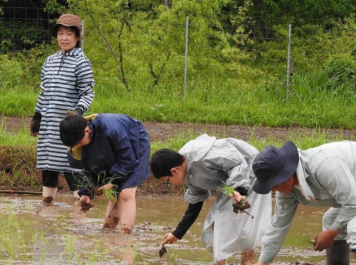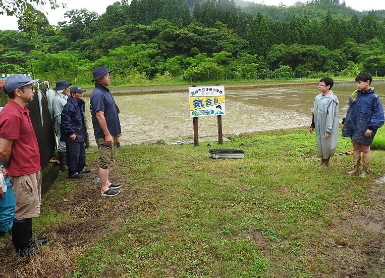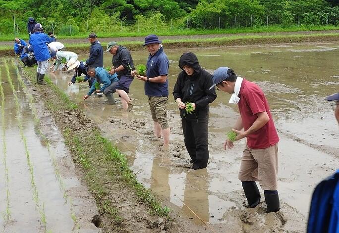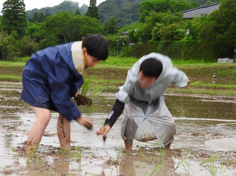今日は坪谷小学校の実習田、その名も「気合田(きあいだ)」において、五色米の田植えを行いました。この五色米とは、稲の穂の色が違う苗を色ごとに分けて植えることで、秋には田んぼが五色になることからそう呼ばれているそうです。小雨が降るあいにくの天気ではありましたが、五色米の田植えを長く支えてきた方をはじめ、地域協力者が10名ほど集まっていただき、一緒に田植えをしてくださいました。おかげで予定よりも早く植え終わることができました。ご協力いただいた皆様、取材に来てくださった皆様、本当にありがとうございました。