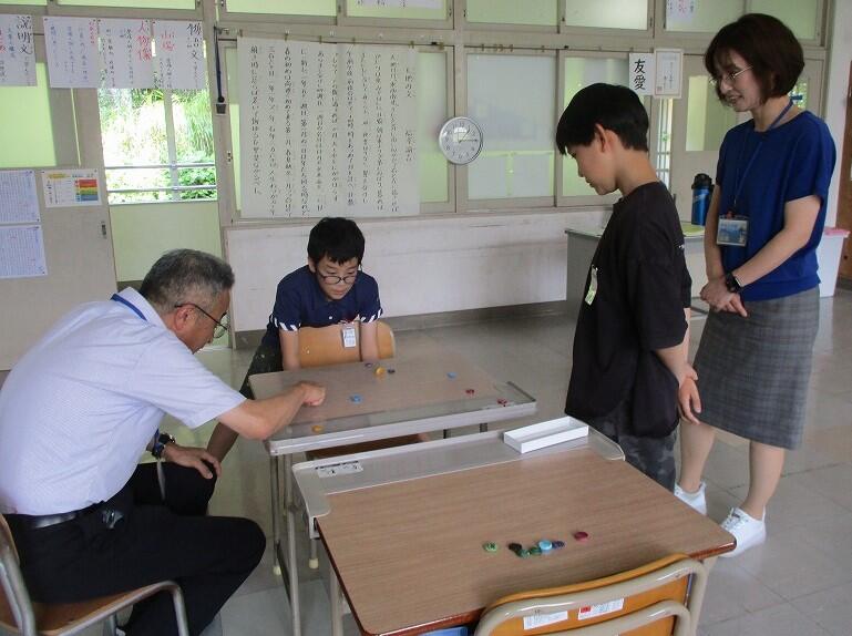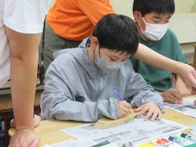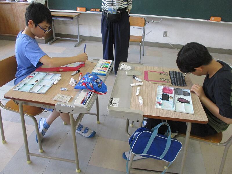 また、4時間目の図工の授業を見に行くと、糸のこで切り出した板の絵に黙々と色塗りをしていました。今度は「静」で頑張る2人のつぼやの子。とてもメリハリのある一日でした。