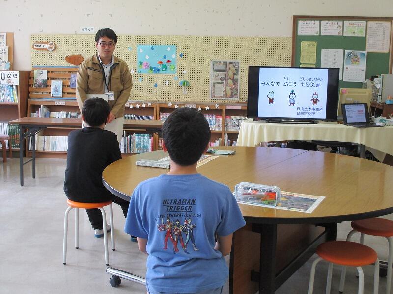 今日の3時間目は、日向土木事務所及び日向市防災推進課の方々においでいただき、土砂災害防止教室を実施しました。この教室は毎年行っているものですが、土砂災害への備えや警戒が必要な本校では毎年実施しています。子ども達は、講師の方々のお話をしっかり聞き、時には質問するなどして理解を深めていました。