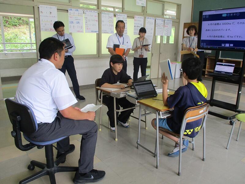 今日の3時間目の算数は、「比例・反比例」という単元の学習をしていました。この単元では、問題文から何となく比例か反比例かを予想しても解ける問題があるので、意味をしっかりおさえて学習しなければいけません。(いわゆるマグレ当たり)下の写真は、そんなことがないように、児童一人一人に式の意味やその解き方の根拠を担任が確認している場面です。子ども達は、何度も担任とやり取りをしながらじっくり考える(力をつける)学習をしていました。