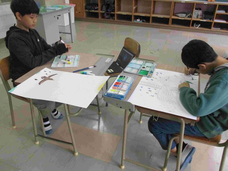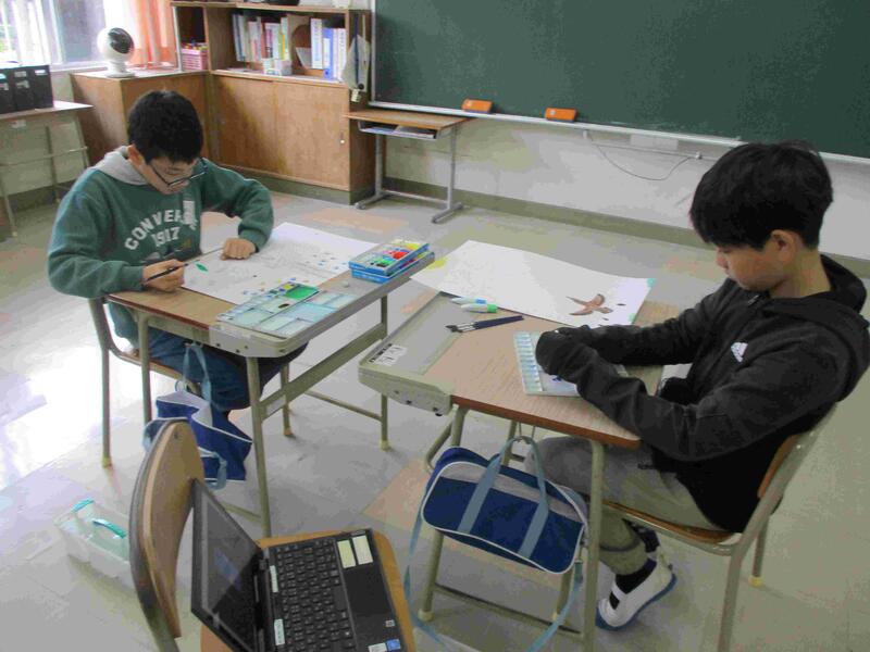 今日の3時間目の図工は「読書感想画」に取り組んでいました。さて、どんな本を読んでの感想画でしょうか?想像しながら写真をご覧ください・・・・。