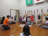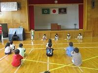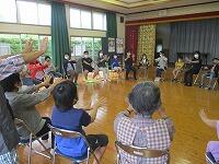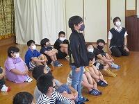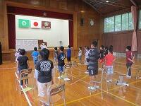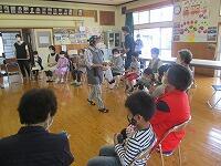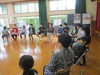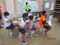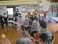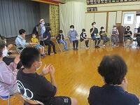その後は、サロンの方々が準備していただいた昔の遊びを楽しみました。椅子を丸く置き、子どもたちとサロンの方々が必ず隣になるように座って、おじゃみと手遊び歌を楽しみました。おじゃみを使った「あんだがたどこさ」では、本当は、最後全員が1こずつおじゃみを持つはずなのに、1個も持っていない子がいたり、逆に2個持っている子がいたりして思わずあちこちから笑い声が聞こえてきました。手遊び歌は、「ガッコ」で手を前に出し、「ゲッコ」で手を引き、「ピョン」で手のひらを上にしてぱっと指を開く、この3つの動きを歌詞に合わせて行う遊びでした。みんなが一生懸命やればやるほど何となく楽しくなるとてもユニークな手遊び歌でした。実はいつしかこの「ガッコガッコガッコ、ゲッコゲッコ、ピョン」の歌が耳にやきつくほど、完全にはまってしまいました。サロンの方々、今日は、楽しい時間を本当にありがとうございました。ワクチン接種も進んでいるので、今年は、2学期と3学期も実施できると思いますので、よろしくお願いします。