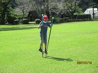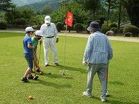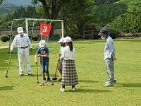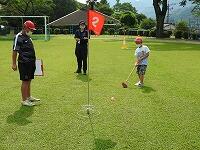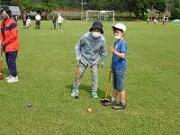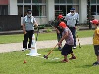 今日のふれあい活動は、グランドゴルフです。実は、昨年度は、コロナ感染防止のため中止を余儀なくされ、一昨年度は雨天のため体育館での活動であったということで、3年生以下の子どもたちは、今日が初めてのグランドゴルフでした。そのためか、競技を始めてしばらくは、空振りが出たり、当たっても1mぐらいしかボールがとばない子が続出していましたが、ホールが進むごとに「カキ~ン」という心地よい打球音や「すごい」という歓声も聞かれるようになりました。始めた頃の曇り空から少しずつ日差しが強くなり、定期的に給水タイムを設定しながらの活動でしたが、地域の方々と会話をしながらの楽しい活動になりました。ちなみに今日は、子どもたち全員が名前を大きく書いたテープを胸にはりました。今日の活動で、一人でもたくさんの子どもたちの名前を覚えていただいていたらうれしいですね。