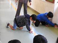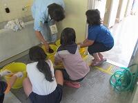 初めの会では、掃除の前にストレッチを中心にした準備運動が設定されていました。はじめは、掃除の前に不思議な感じだったのですが、活動が始まってすぐに納得しました。棒たわしやデッキブラシを一切使用しません。亀の子だわしやスポンジを中心に体全体を使って掃除を行っていきます。子どもたちが、本当にこの作業ができるか不安でしたが、みんな腰を据えてしっかりと便器をこすっていました。見る見る間に白く輝いていく便器を見て、さらに子どもたちの磨く手に力が入ってきているように感じられました。仕上げでは、かべをスポンジで拭き上げ、全員が亀の子で床をこすりました。途中きれいになっていくトイレを見ながら、子どもたちの表情に満足そうな表情や笑顔が見られました。掃除が全て終了する頃には、きれいになったことはもちろんですが、かすかに感じていたにおいも一切しなくなっていました。