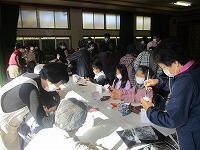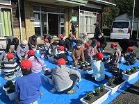 今回は、まず初めに牛乳パックを使ったペン立てをサロンの方々に教えていただきながら作りました。子どもたちの人数よりも多いたくさんのサロンの方々に集まっていただき、子どもたち全員がサロンの方々とペン立てを作りながら楽しく交流を図ることができました。ペン立て作りを全員が終えると次にプランターへの花の苗植えをサロンの方々とペアで行いました。