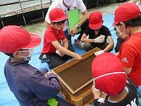 3校時から、実際の種まきを行いましたが、とにかくすごい雨で、あいさつや説明の声も聞き取りにくいような状況でした。ただ、実際の活動が始まると、各グループの班長を中心に実に手際よく作業を進めていました。ちなみに本年度は、1年生と転入生を合わせて5名の子どもたちが初めての種まきでしたが、経験している友だちに教えてもらいながら楽しく活動していました。種の段階ですでに色が五色ついていることも初めての子どもたちにとっては、新鮮な驚きだったことでしょう。