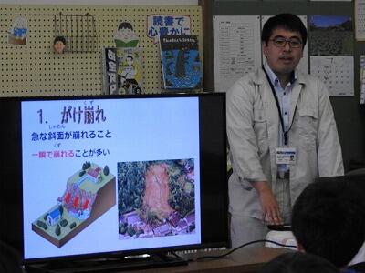 今日は、県や市の土木事務所の方々に来ていただき、土砂災害防止について学習しました。山間部にある坪谷小学校は、土砂災害から身を守る力を高めておくことが大切です。今回は、後半から自分が住んでいる地区ごとに分かれ、自宅にいる時にはどんなことが大切なのかについても学習しました。とても良い学習ができました。指導してくださった土木事務所の皆さん、ありがとうございました。