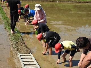 高学年による「田植えの仕方」の説明、地域教育ネットワーク協議会:寺原さんによる説明のあと、田植えを始めました。上級生が下級生に教える姿や地域の方や保護者の方が手伝ってくださる場面もあり、まさにみんなが一丸となって田植えをすることができました。