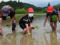 今日は、2時間目から4校時までを利用して、田植えを行いました。植えた苗は、5月20日に子どもたちが種まきをした苗です。今年は、種をまいた時期から植えるまでの時期がとてもうまくいったというお話をネットワークの会長さんからしていただきました。今回は、とにかく愛情を込めて丁寧に植えることを目標に田植えを行いました。ただ途中で尻もちをついたり、どろがはねてしまってたりして、どろんこまみれになってしまった子が多数出ましたが、表情はみんなとびっきりの笑顔でした。全てが終了すると会長さんから「今年は、とても上手に植えることができましたね。」お褒めの言葉をいただきました。確かに今回は、田植えを初めての経験する子どもたちも多かったのですが、地域の方や保護者、先生方に教えてもらいながら上手に田植えを行うことができました。