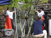 今日は、牧水祭当日でした。朝から雨模様で、テントの中で、フェイスシールドを付けた状態での発表になることを覚悟していました。ところが、発表の場である牧水生家に子どもたちが到着し、式典が始まるころには、雨もあがり、テントも急遽撤去されました。