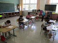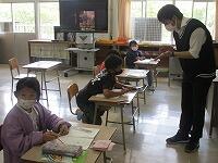 子どもたちの授業の様子を見ていると、何事もなく普通に授業に参加していました。1・2年生は、算数で1年生は、数字の書き方。2年生は、プリントを使って時計の学習の復習を複式授業で行っていました。3・4年生は、体育で体づくりの運動で腕立てふせに挑戦していました。5・6年生は、理科でメダカのオスとメスのちがいを見つけながら観察していました。