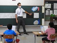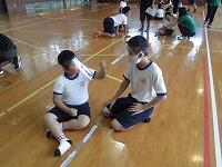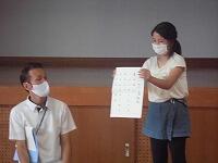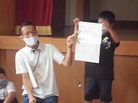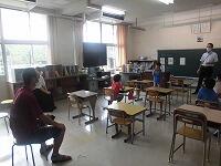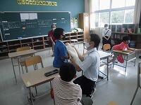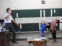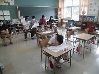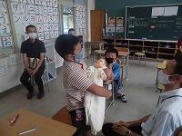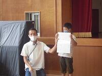 運動会の練習後、牧水祭に向けて、発表方法における変更点の確認を行いました。今回の牧水祭は野外で行う関係で、間隔を十分に確保した上でマスクなしで行う予定でした。しかし、天気予報を見ると、発表当日は、雨天の可能性が出てきました。雨天の場合、テント内で発表することになり、ソーシャルディスタンスを確保できないため、フェイスガードを付けて発表することにしました。子どもたちは、案外気に入っていましたが、できれば、フェイスガードなしで発表できる天気になることを祈りたいと思います。なおフェイスガードをした状態でも発表そのものに問題はありませんでした。