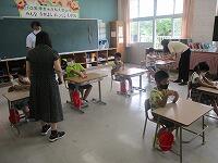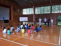 その場合、無言でいかに迅速に避難できるかが大切になります。事前指導が徹底してあり、写真では伝わりませんが避難中全く子どもたちの声は聞こえませんでした。さらに、安全担当の職員の話も集中してしっかりと聞くことができました。残念ながら、この時間帯雨が強くなったため、公民館までの避難は省略しましたが、緊張感をもって真剣に取り組むことができたように思います。