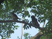 アオバズクが、今年も玄関前のセンダンの木にやってきたことを以前お知らせしました。今年はこれまで2羽を確認していましたが、1羽ずつ離れた場所にとまっていました。ところが、今朝何やら子どもたちが歓声をあげながら上を見ていたので、声をかけてみると、アオバズクが3羽になっていました。その中の小さい2羽が仲良く細い枝に仲良くとまっているのが確認できました。2羽とも見ている私たちの方をじっと見つめていて、その姿がとても可愛いかったので、シャッターを押しました。今朝は、朝から心が温まるような良い物を見せてもらいました。