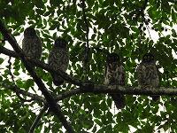昨日アオバズクの紹介をしましたが何と何と何と。今日は、いっきに5羽もやってきました。さらに写真のようにそのうち4羽がきちんと並んでとまっていたのです。アオバズク自体は、毎年のように見ていますが、4羽もの数が仲良く固まって、とまっている姿は初めて目にしました。また、1羽だけ大きめのアオバズクが違う枝にとまっていましたが、4羽に比べ体が大きく親として子どもたちを見守っているように見えました。正式に親子かどうかは、専門家ではないので分かりません…。昨年に比べ、本校は子どもたちの数が大きく増えました。アオバズクも子どもたちの数に負けないように増えたのかな。