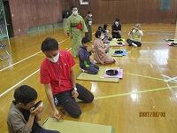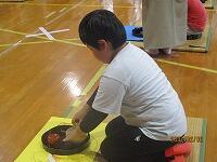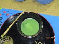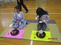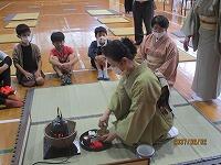 姿勢が整うと、茶道の歴史について教えていただき、お茶入れからお茶をいただくまでの作法のお手本を見せていただきました。その後は、和菓子をいただき、それぞれが茶立てに挑戦しました。姿勢を保持したまま茶立てを行い、とても落ち着いた雰囲気の中で茶立てが進みました。中には、泡立てがとても上手でおいしそうなお茶が完成している子どもがたくさん見られました。本来は、立てたお茶を人に振る舞うことが基本なのですが、新型コロナの感染防止を考慮し、今回は、自分の立てたお茶は自分でいただきました。ただ、講師の方に「もう一杯飲みたい人。」と聞かれると全員が迷わず挙手をし、全員が二杯目もおいしくいただきました。作法だけでなく、お茶のおいしさも十分に味わった茶道教室でした。