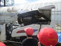 脱穀の最後には、田主の地域ネットワーク会長より所有されているコンバインの内側を見せてもらいました。すると、何と足踏み脱穀機の一部がそのままコンバインに活用されていたのです。子どもたち以上に先生方から驚きと感動の声が聞かれました。今日も子どもたちはもちろん先生方も貴重な経験をさせていただきました。会長さん今日もありがとうございました。