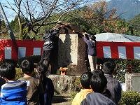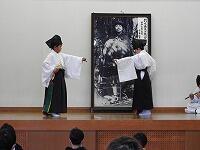 来賓紹介、学校長挨拶、児童による牧水の歌発表、教育長挨拶、牧水顕彰会会長挨拶、児童による自作短歌の発表、牧水顕彰会理事による児童の作品の講評、神楽保存会による子ども神楽の披露、学校の短歌が刻まれた歌碑における献酒・献花及び短歌朗詠、式典の全てが終わると、子どもたちが種から育てた五色米の販売、本校のマスコット「繁(しげる)君」による子どもたちへのプレゼントと記念撮影というもりだくさんの内容でした。