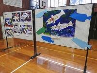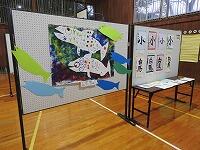 1・2年生の作品は、個人作品とグループ作品で色鮮やかな魚たちでした。3・4年生は、牧水先生について調べたことを模造紙にまとめたものと、習字を展示していました。5・6年生は、読書感想画と短歌でした。その他にも子どもちが一番好きな短歌を書き込んだ牧水先生の肖像画もあります。
