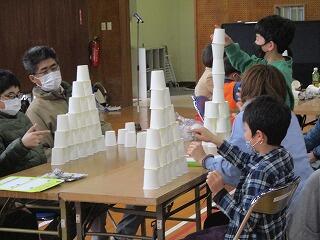 今年度、最後の家庭教育学級は親子のふれあいを深める親子レクリエーション形式で、「紙コップタワー」や「親子ですごろく」などなど、たくさんのゲームを行いました。