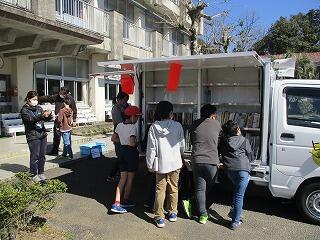 市立図書館の方が本をたくさん車に積んで学校に来てくださいました。
