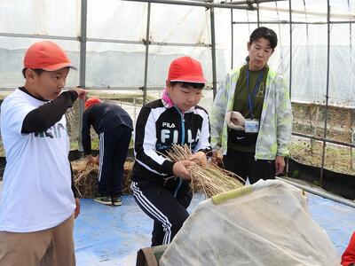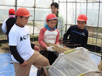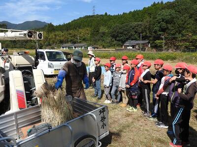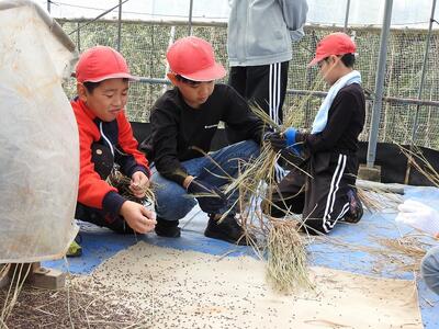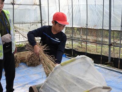 今日は、五色米の脱穀をしました。地域ネットワークの方にご協力をいただき、昔のやり方、現在のやり方を学びました。全校で協力してきれいに脱穀することができました。
