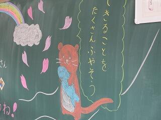 教室の後ろには、先生が黒板にチョークで歓迎の絵と言葉のプレゼントを描いてくださっていました。
