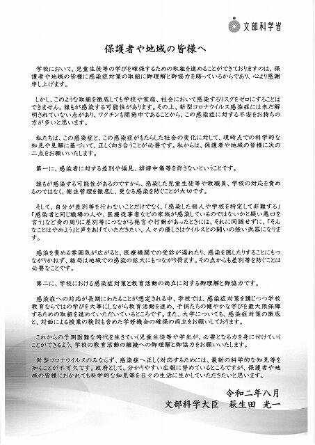 なお9月8日(火)の給食は、7日に食材をすべて揃えることが困難な状況ですので、給食はありません。8日(火)に登校することとなった場合には、弁当持参になります。大変、恐れ入りますが、そのための心づもりと準備をお願いいたします。