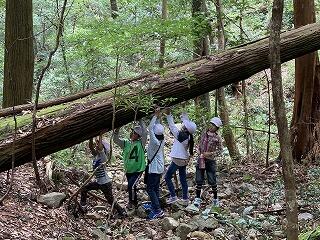 チェーンソーで木を伐採しているところをあまり見る機会のない子どもたちは、休み時間ごとにローカからのぞいていました。