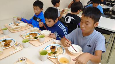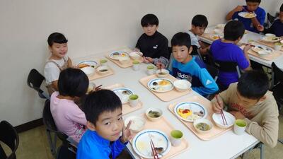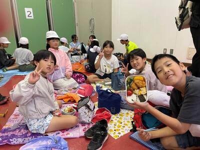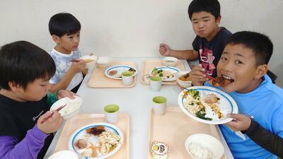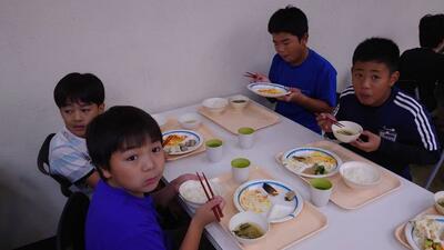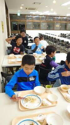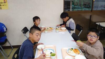 また、食事でも美々津小学校の友達と交流していました。登山やカルタの活動を通して、さらに仲が深まったようです。