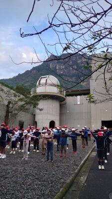今日のむかばき青少年自然の家の天気はくもりです。朝のつどいは、屋外で実施しました。つどいでは、みんなで元気よく体操をしました。
