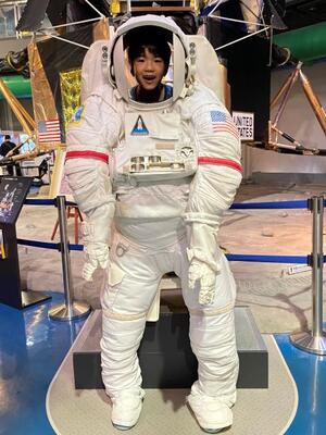 館内には宇宙服の模型があります。このように顔を出してみると、まるで宇宙服を着ている気分になります。