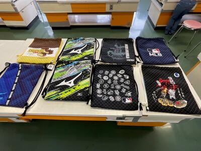 5年生のナップサック製作ですが、全員完成しました。下がその写真です。どのナップサックもよくできていますね!