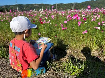 その次に、コスモス畑で鬼ごっこをしたり、かくれんぼをしたり、寝そべってみたりと、いろんな遊びをしました。楽しそうに遊ぶ子どもたちの顔は、コスモスの花のように輝いていました。