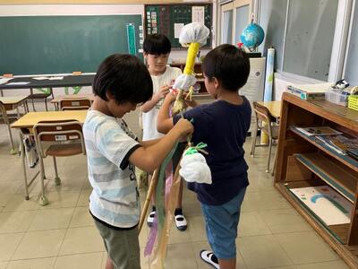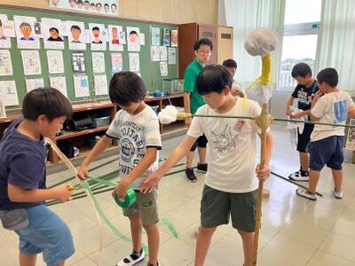 5年生の子どもたちが協力してはじめての案山子もどき?づくりに挑戦。