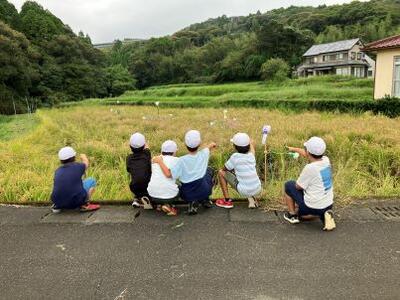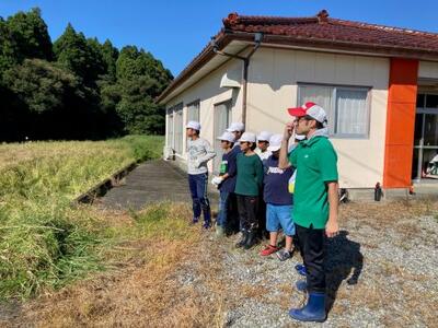 5月15日(水)に、保護者の方、地域の方、JAの方などの協力の下で、田植えを行いました。それから4か月近くが過ぎ、収穫できるまでに育ちました。イノシシに侵入されたり、スズメに爆食されたりと、順調とはいえない面もありました。稲刈りも雨のために、2回も延期になりました。自然を相手にしていることなので仕方がないことではありますが、稲刈りの日を何とか迎えることができてほっとしています。